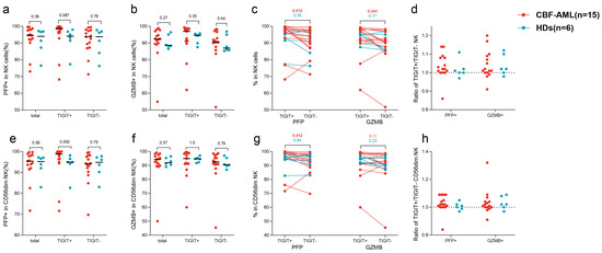 The impact of TIGIT expression on NK cell cytotoxicity in CBF-AML patients and HDs. PFP+ cells% in total NK cells (a), GZMB+ cells% in total NK cells (b), PFP+ cells% and GZMB+ cells% in pairing of TIGIT+ to TIGIT− cells in total NK cells of individual cases (c), PFP+ cells% and GZMB+ cells% ratios of TIGIT+/TIGIT− NK cells (d), PFP+ cells% in CD56dim NK cells (e), GZMB+ cells% in CD56dim NK cells (f), PFP+ cells% and GZMB+ cells% in pairing of TIGIT+ to TIGIT− cells in CD56dim NK cells of individual cases (g), and PFP+ cells% and GZMB+ cells% ratios of TIGIT+/TIGIT− CD56dim NK cells (h). Numbers in this figure refer to the p values.