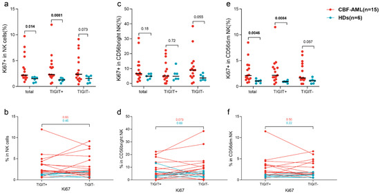 The impact of TIGIT expression on NK cell proliferation in CBF-AML patients and HDs. Ki67+ cells% in total NK cells (a), CD56bright NK cells (c), and CD56dim NK cells (e). Ki67+ cells% in pairing comparison of TIGIT+ to TIGIT− cells in total NK cells (b), CD56bright NK cells (d), and CD56dim NK cells (f). Numbers in this figure refer to the p values.