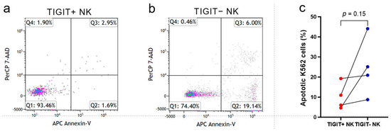 TIGIT+ NK and TIGIT− NK cells sorted from four newly diagnosed CBF-AML patients were evaluated for K562 cell-killing activity (Figure 5a,b). Though the significant difference was not limited by the number of cases (p = 0.15), all four patients showed the same tendency: the proportion of apoptotic K562 cells in the TIGIT+ NK cells was lower than that in TIGIT− NK cells (Figure 5c). The apoptotic K562 cells proportion ratios of TIGIT− NK to TIGIT+ NK were 1.1, 1.4, 4.0, and 5.4, respectively. Therefore, TIGIT expression on NK cells was related to lower K562 cell-killing activity.
