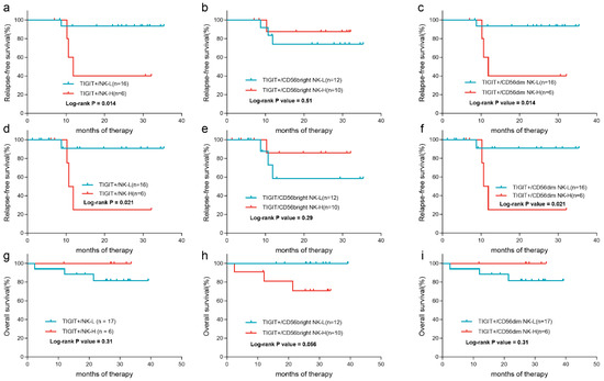 According to the ROC curves based on relapse, 55.1%, 43.0%, and 56.2% were the optimal cutoff values for the percentage of TIGIT+ cells in total NK cells, CD56bright, CD56dim NK cell subsets to categorize patients into high (-H) and low (-L) groups (AUC = 0.69, p = 0.23; AUC = 0.78, p = 0.089; AUC = 0.71, p = 0.20), respectively (Figure S6). Patients with high percentages of TIGIT+ cells in total NK cells and CD56dim NK cells had significantly poorer RFS than those with low percentages (3-year RFS rate: 40.0% (95%CI: 5.2–75.3%) vs. 93.3% (95%CI: 61.3–99.0%), p = 0.014; 40.0% (95%CI: 5.2–75.3%) vs. 93.3% (95%CI: 61.3–99.0%), p = 0.014) (Figure 6a,c), respectively, while the percentage of TIGIT+ cells in CD56bright NK cells was not related to patient’ RFS rates (3-year RFS rate: 87.5% (95%CI: 38.7–98.1%) vs. 74.1% (95%CI: 39.1–90.9%), p = 0.51) (Figure 6b). Similarly, when censoring at the time of allo-HSCT, patients with high frequencies of TIGIT+ cells in total NK cells and CD56dim NK cells had significantly lower RFS rates than those with low frequencies (3-year RFS rate: 25.0% (95%CI: 0.90–66.5%) vs. 90.9% (95%CI: 50.8–98.7%), p = 0.021; 25.0% (95%CI: 0.90–66.5%) vs. 90.9% (95%CI: 50.8–98.7%), p = 0.021) (Figure 6d,f). In contrast, the TIGIT+ cells in CD56bright NK cells showed no correlation with RFS (3-year RFS rate: 85.7% (95%CI: 33.4–97.9%) vs. 58.3% (95%CI: 18.0–84.4%), p = 0.29) (Figure 6e). As for OS, patients with a high percentage of TIGIT+ cells in CD56bright NK cells tended to have a significantly poorer OS compared with those with a low percentage (3-year OS rate: 70.7% (95%CI: 33.7–89.5%) vs. 100.0%, p = 0.056) (Figure 6h) while the other two groupings did not correlate with OS (p = 0.31 and 0.31) (Figure 6g,i).