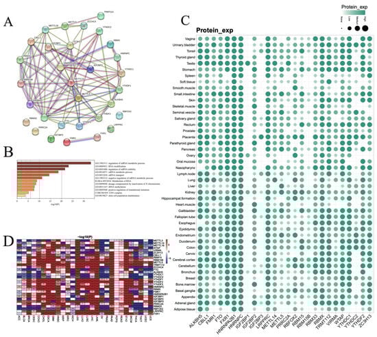 Expression levels of m6A modification genes across cancer types. (A) Protein–protein interaction (PPI) analysis of genes. (B) GO annotation of genes. (C) Protein expression levels of genes in various tissues. (D) Expression differences in various normal and cancer tissues. (* p < 0.05, ** p < 0.01, *** p < 0.001, **** p < 0.0001).
