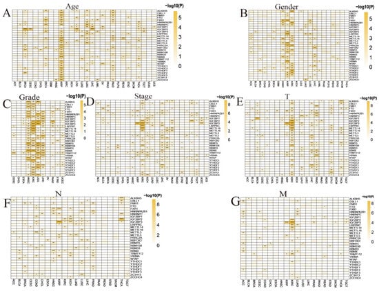 Clinicopathological characteristics of m6A modification genes in each cancer. Expression of m6A modification genes between (A) age groups, (B) gender, (C) grade, (D) stage, (E) T, (F) N, and (G) M groups. (* p < 0.05, ** p < 0.01, *** p < 0.001, **** p < 0.0001).