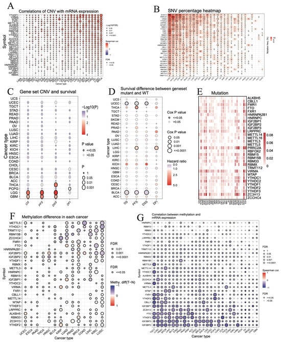 We obtain copy number variants (CNVs), single nucleotide variants (SNVs), and methylation data for multiple cancer types from the GDC (https://portal.gdc.cancer.gov/ accessed on 30 May 2024) database. For each cancer, we calculate the percentages of heterozygous amplifications, homozygous amplifications, heterozygous deletions, and homozygous deletions of m6A modification genes. Additionally, we determine the correlation between CNV, methylation status, and RNA expression, as well as the SNV percentage and methylation differences for each cancer. Furthermore, we use the univariate Cox regression model to analyze the survival impact of CNVs and compare the differences between mutant and wild-type cases.
