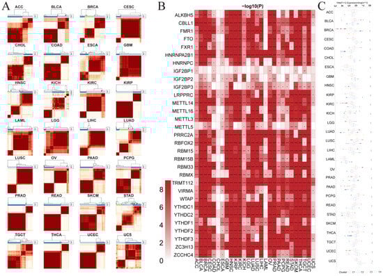 Consensus cluster analysis of m6A modification genes in each cancer. (A) Consensus cluster analysis of different tumors. (B) Heatmap showing the differential expression of genes between the clusters in each tumor. (C) Differential expression of TRMT112 between the clusters in each tumor. (* p < 0.05, ** p < 0.01, *** p < 0.001, **** p < 0.0001).