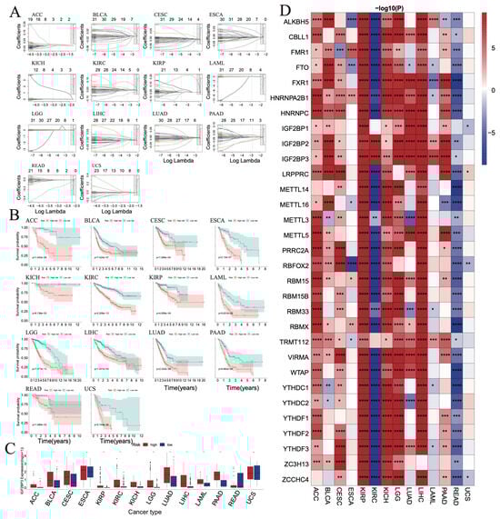 Prognostic model of m6A modification genes in each cancer. (A) LASSO regression is used to screen for important genes in each tumor. (B) Survival curves of patients between high- and low-risk groups in each tumor. (C) Differential expression of IGF2BP3 between high- and low-risk groups in each tumor. (D) Heatmap showing the differential expression of genes between high- and low-risk groups in each tumor. (* p < 0.05, ** p < 0.01, *** p < 0.001, **** p < 0.0001).