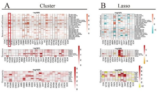 Association of immune cell infiltration, tumor stemness score, and genomic heterogeneity with RNA m6A regulators in TCGA pan-cancer cohort. (A) Differential immune cell infiltration, tumor stemness score, and genomic heterogeneity between clusters in each tumor. (B) Differential immune cell infiltration, tumor stemness score, and genomic heterogeneity between high- and low-risk groups in each tumor. (* p < 0.05, ** p < 0.01, *** p < 0.001, **** p < 0.0001).