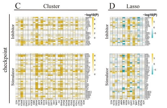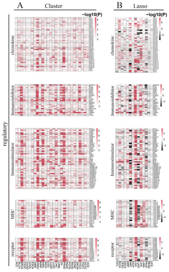We analyze the immune regulatory genes, including chemokines, immunoinhibitors, immunostimulators, MHCs, and receptors, among different clusters in each tumor type and between high- and low-risk groups. We also investigate the immune checkpoint genes in the TCGA pan-cancer cohort by analyzing the inhibitory and stimulatory genes.