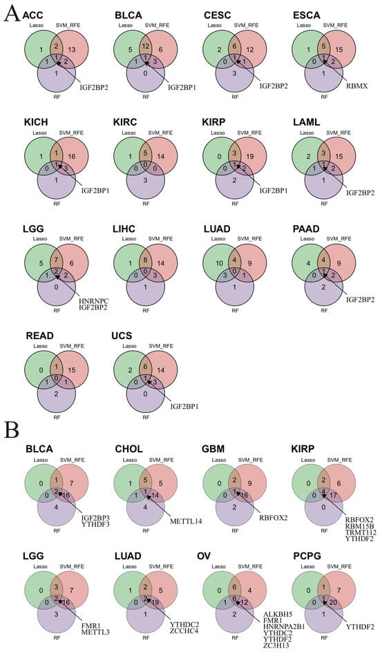 Three machine-learning algorithms, including LASSO, support vector machine-recursive feature elimination (SVM–RFE) [], and random forest (RF) [] algorithms are used to identify the m6A-related biomarkers in each cancer type based on the RNA expression and CNV. We introduce the LASSO algorithm above. We use the SVM algorithm to train a model based on the RNA or CNV data [], and then the SVM–RFE algorithm is employed to iteratively refine the feature set by eliminating the least significant features and enhancing the model’s predictive accuracy []. The RF algorithm is used to rank the importance of genes []. The genes with a relative importance score above 0.25 are considered significant. The biomarkers are identified by the intersection results of LASSO, SVM-RFE, and RF methods.