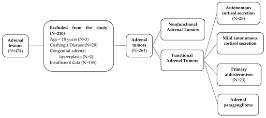 We conducted a retrospective analysis using data from the medical files of 474 patients with adrenal pathology hospitalized between January 2007 and January 2020, before the COVID-19 pandemic, using the ICD-10 codes. Inclusion criteria were patients with adrenal tumors, admitted at least one time in our clinic, older than 18 years. Exclusion criteria were patients with insufficient data and other adrenal pathology, e.g., Cushing’s disease with adrenal hyperplasia, congenital adrenal hyperplasia, etc. Data collection and data entry were carried out by the same operator, and data were verified afterwards by a different person. After applying these criteria, a total of 264 patients with adrenal tumors were enrolled in the study, as seen in Figure 1.