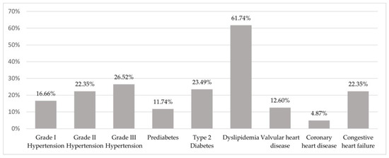 Of the 264 patients included in the study, 91 (34.47%) presented normal blood pressure values, while 44 of them (16.66%) had grade I hypertension, 59 (22.35%) had grade II hypertension, and 70 (26.52%) had hypertensive crisis or grade III hypertension. Overall, 31 (11.74%) patients presented with prediabetes, 58 (21.97%) presented with diabetes mellitus type 2 treated with oral hypoglycemic medications, and 4 (1.52%) had diabetes mellitus type 2 treated with insulin. The rest of the patients had normal glucose metabolism, and none of them had diabetes mellitus type 1. Abnormalities regarding lipid metabolism were present in 163 (61.74%) patients, 90 (34.09%) of which had mixed dyslipidemia, while 68 (25.76%) had hypercholesterolemia, and 5 (1.89%) had hypertriglyceridemia. In terms of cardiovascular comorbid conditions, 246 (93.18%) had a history of cardiometabolic disorders, of which 25 (9.47%) patients had valvular heart disease, 31 (12.6%) had coronary heart disease, and 12 (4.87%) had congestive heart failure. The cardiometabolic characteristics of the study population are presented in Figure 2. Extra-adrenal malignancy was observed in 59 (22.35%) patients.