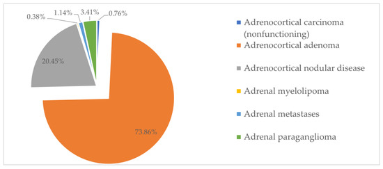 Based on pathological reports, paraclinical data, and imaging data, all the tumors were classified according to the 2022 WHO classification of tumors of endocrine organs [20]. Most of the tumors (96.59%) were found in the adrenal cortex, while only 3.41% were located in the adrenal medulla. Out of the 255 tumors of the adrenal cortex, 195 (73.86%) were adenomas, 54 (20.45%) were cases of adrenocortical nodular disease, 3 (1.14%) were metastases of other malignant tumors, 2 (0.76%) were adrenocortical carcinomas (ACCs), and only 1 (0.38%) was an adrenal myelolipoma, as seen in Figure 3. According to the hormonal evaluation, out of the 195 adrenocortical adenomas, 148 (75.89%) were nonfunctioning tumors, 22 (11.29%) presented autonomous cortisol secretion, 9 (4.62%) presented MACS, and 16 (8.20%) secreted aldosterone. Out of the 54 adrenocortical nodular diseases, 36 (66.67%) were nonfunctioning, 6 (11.11%) secreted cortisol, 5 (9.26%) presented MACS, and 7 (12.96%) secreted aldosterone. The cases of adrenal myelolipoma, the metastases, and the ACCs were not associated with hormonal excess. All the other 9 tumors were located in the adrenal medulla and were adrenal paragangliomas, formerly known as pheochromocytomas. All adrenal paragangliomas presented catecholamine hypersecretion. Therefore, within the whole group of patients, 190 (71.97%) tumors were nonfunctioning, 28 (10.61%) secreted cortisol, 14 (5.30%) presented MACS, 23 (8.71%) secreted aldosterone, and 9 (3.41%) were adrenal paragangliomas that secreted catecholamines (Table 2).