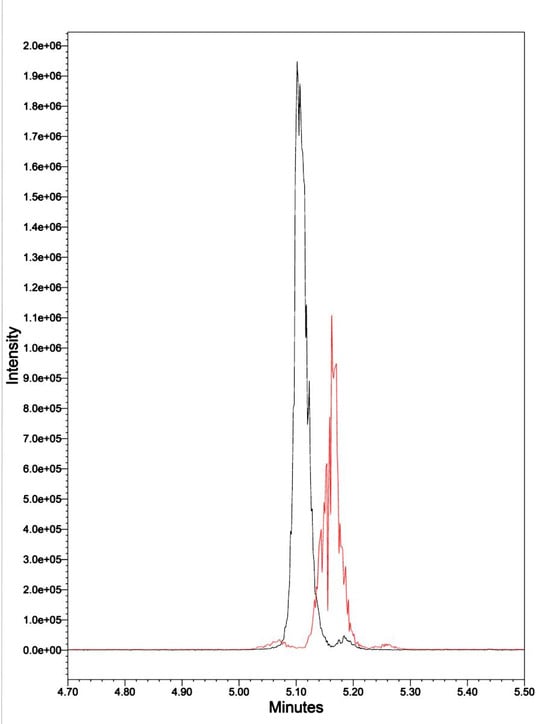 In previous research [9], we demonstrated that our stock of purified natural Kalata B1 was 95.4% pure. We commissioned CSBio (Menlo Park, CA, USA) to synthesize 30 mg of synthetic Kalata B1, which is documented at 97.51% pure. They synthesized a linear cyclotide, cyclized it, and folded it using head-to-tail lactam bonding and natural oxidation (Figure S1). The present UPLC-MS analyses of both synthetic and natural Kalata B1 indicated they had an elution time of 5.05–5.25 min., and both have a m/z of 964.77. There was a slight shift in the elution time, which was attributed to matrix interference (Figure 2).
