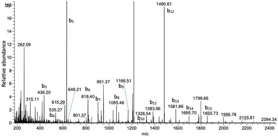 The Orbitrap analysis of the alkylated and enzymatically digested peptides revealed the presence of ions consistent with digested Kalata B1 (e.g., Figure 3). The assessment of the masses observed showed good consistency with the exact masses expected, with m/z values of 845.3799 and 1215.9891 observed for peptides 1 and 2, respectively. Sequence analysis of the two peptides showed daughter ions consistent with the expected sequences (Table 1 and Table 2). For peptide 1, all the amino acids could be found in this 8-mer peptide (Table 1), whereas only 19 of the 21 amino acids could be sequenced for peptide 2 (Table 2). However, given the expected vs. observed m/z ratios of the parent peptides (845.3821 vs. 845.3799, peptide 1 and 1215.9894 vs. 1215.9891, peptide 2), both peptides match Kalata B1, with 93% coverage of the peptide according to Proteome Discoverer (Thermo Scientific) assessment of the sequence.