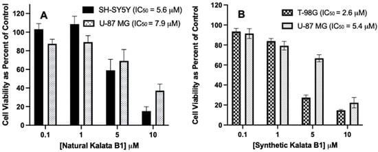 Effect of natural and synthetic Kalata B1 on cell viability in SH-SY5Y, U-87MG, and T-98G cells cultures. The IC50 values for the cyclotides were determined using MTT assay after incubation with cells at increasing concentrations (0.1, 1, 5, and 10 μM) as compared to the control. Panel (A): SH-SY5Y and U-87 MG cells, and panel (B) T-98G and U-87 MG cells. Cultures (6000 cells per well in a 96-well plate), were treated with the cyclotide indicated, for 72 h, then MTT measured. Cell viability was calculated as a percentage of control cultures. IC50 values were calculated using the Best Fit method (See Table 1). Incubations were conducted in 96-well plates in triplicate wells (technical replicates) and as three independent incubations (biological replicates, n = 3). Data are expressed as mean ± standard error of the mean (SEM). The results are graphed in GraphPad Prism version 9 for iOS.
