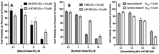 Comparison of IC50 values for natural and synthetic Kalata B1, as determined in SH-SY5Y, U-87 MG, and T-98G human cell cultures. Panel (A) includes SH-SY5Y and U-87 MG cells, panel (B) includes T-98G and U-87 MG cells, and panel (C) is natural Kalata B1 and synthetic Kalata B1 with concentrations of 0.1, 1, 5, and 10 μM as compared to the control. Cultures were plated in 96-well pates at 6000 cells/well, then treated with cyclotides, as indicated, for 72 h, then assayed using MTT. Cell viability was calculated as a percentage of control (where the control cells were treated with DMSO only). Incubations were conducted in 96-well plates in triplicate wells (technical replicates) and as three independent incubations (biological replicates, n = 3). Data are expressed as mean ± standard error of the mean (SEM). IC50 values were calculated using the Best Fit method in GraphPad Prism version 8.0 (IC50 Best Fit). Results are graphed in GraphPad Prism version 8 for iOS.