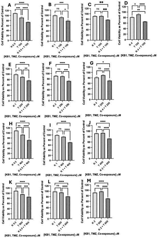 Synthetic Kalata B1 increased TMZ-induced cell death in U-87 MG glioblastoma cultures. To determine if synthetic Kalata B1 (K) enhances TMZ (T)-induced cell death in U-87 MG cells, MTT was measured after incubating the cell cultures with concentrations of K (0.5, 1.0, 2.0, and 4.0 μM) and T (100, 200, 400, and 800 μM) both alone and when co-exposed to synthetic Kalata B1 and TMZ as illustrated in panels (A–M). The first dotted bars in each panel indicate the cells exposed to concentrations of synthetic Kalata B1 alone, while the second diagonal stripe bars indicate the cells exposed to TMZ alone. The third checkered bars indicate co-exposure treatments with synthetic Kalata B1 and TMZ. The cells were plated into 96-well plates (6000 cells/well) and treated with synthetic Kalata B, as indicated, for 72 h. Cell viability was measured using MTT and expressed as a percentage of control cultures (culture medium with DMSO only). Incubations were conducted in triplicate wells (technical replicates) and as three independent incubations (biological replicates, n = 3). Data are expressed as mean ± standard error of the mean (SEM). Results of one-way analysis of variance (ANOVA) and Tukey’s multiple comparisons are graphed in GraphPad Prism version 9 for iOS with the following p-values: * < 0.05, ** < 0.01, *** < 0.001, and **** < 0.0001. ns = not significant.