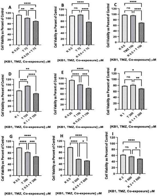 Synthetic Kalata B1 increased TMZ-induced cell death in T-98G glioblastoma cultures. To determine if Kalata B1 (K) enhances TMZ (T)-induced cell death in T-98G cells, MTT was measured after incubating cell cultures with synthetic Kalata B1 (0.25, 0.5, 1.0, and 2.0 μM) and TMZ (T 75, 150, 300, and 600 μM) both alone and when co-exposed as illustrated in panels (A–I). The first dotted bars in each panel indicate the cells exposed to synthetic Kalata B1 alone, while the second diagonal stripe bars indicate the cells exposed to TMZ alone. The third checkered bars indicate co-exposure treatments with synthetic Kalata B1 and TMZ. The cells were plated into 96-well plates (6000 cells/well) and treated with synthetic Kalata B1, as indicated, for 72 h. Cell viability was measured using MTT and expressed as a percentage of control cultures (culture medium + DMSO only). Incubations were conducted in triplicate wells (technical replicates) and as three independent incubations (biological replicates, n = 3). The data are expressed as mean ± standard error of the mean (SEM). The results of one-way analysis of variance (ANOVA) and Tukey’s multiple comparisons are graphed in GraphPad Prism version 9 for iOS, with the following p-values: * < 0.05, ** < 0.01, *** < 0.001, and **** < 0.0001. ns = not significant.
