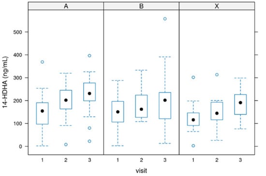 - Souza, P.R.; Marques, R.M.; Gomez, E.A.; Colas, R.A.; De Matteis, R.; Zak, A.; Patel, M.; Collier, D.J.; Dalli, J. Enriched marine oil supplements increase peripheral blood specialized pro-resolving mediators concentrations and reprogram host immune responses: A randomized double-blind placebo-controlled study. Circ. Res. 2020, 126, 75–90. [Google Scholar] [CrossRef] [PubMed]