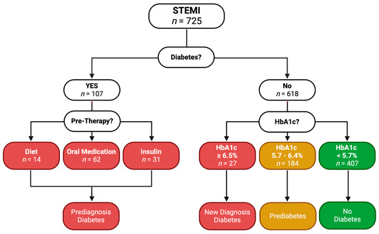 The study population comprised 725 patients presenting with STEMI at a single, large tertiary care center in Salzburg, Austria. These patients were systematically categorized based on their diabetes status. Initially, we screened for a history of diabetes. Of the total, 107 patients (14.8%) had a prior diabetes diagnosis. We reviewed their medical history to determine the nature of their diabetes management, identifying whether they controlled their condition through diet (n = 14, 13.1%), oral medication (n = 62, 57.9%), or insulin ± oral medication (n = 31, 29.0%). Patients falling into these categories were classified as having pre-diagnosed diabetes, regardless of their HbA1c levels.