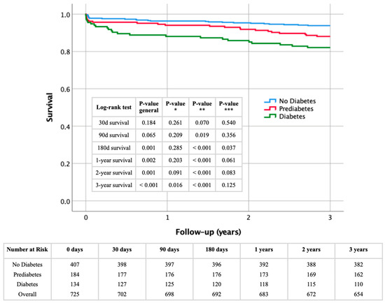 Kaplan–Meier survival analysis with corresponding numbers at risk and log-rank tests for detection of short- and long-term mortality regarding glycemic status in STEMI patients. p* No diabetes vs. prediabetes; p** no diabetes vs. diabetes; p*** prediabetes vs. diabetes.