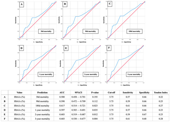 Area Under the Receiver Operating Characteristic (AUROC) analysis of HbA1c with corresponding cut-off values, sensitivity, specificity, and Youden index for short- and long-term mortality in patients with STEMI (Panel (A): 30d mortality; Panel (B): 90d mortality; Panel (C): 180d mortality; Panel (D): 1-year mortality; Panel (E): 2-year mortali-ty; Panel (F): 3-year mortality).
