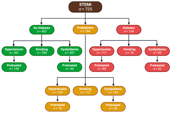 Figure 4 presents a comprehensive flowchart that illustrates the distribution of 725 patients diagnosed with STEMI, categorized by their glycemic status and associated comorbid conditions.