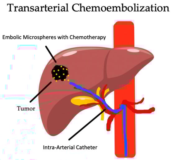 TACE utilizes the same localized ischemia effect as TAE, with the further benefit of the addition of a highly concentrated dose of chemotherapeutic drugs administered with the embolic agent. This is typically doxorubicin but is sometimes cisplatin or mitomycin C. This approach allows for the administration of a higher local dose of chemotherapy than what would be tolerated if given systemically [93]. A diagram of TACE can be seen below in Figure 3. This also results in a synergistic effect with the two mechanisms against NAFLD-HCC, with the localized ischemia inducing the production of VEG-F, which increases vessel permeability which increases the delivery of the chemotherapeutic [94]. Additionally, due to blood stasis, this reduces the local drug clearance, which improves the systemic safety profile [3,95].