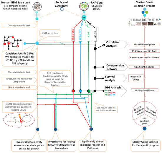 - Kaynar, A.; Altay, O.; Li, X.; Zhang, C.; Turkez, H.; Uhlen, M.; Shoaie, S.; Mardinoglu, A. Systems Biology Approaches to Decipher the Underlying Molecular Mechanisms of Glioblastoma Multiforme. Int. J. Mol. Sci. 2021, 22, 13213. [Google Scholar] [CrossRef] [PubMed]