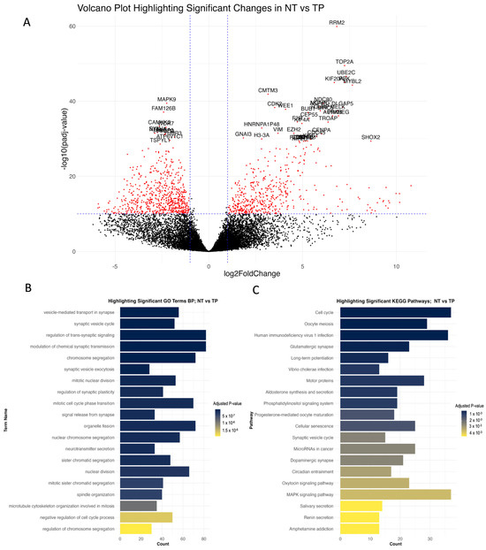Comparative analysis of gene expression and gene-set enrichment analysis in NT vs. TP conditions. (A): Volcano plot displaying comparative analysis results between NT and TP conditions. Red dots indicate genes that are significantly altered. (B): Bar chart detailing the top significantly altered biological processes in TP relative to NT, with the x-axis representing the number of significantly altered genes in each process. (C): Bar chart showing the top significantly altered KEGG pathways in TP compared with NT.