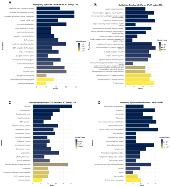 This figure presents the results of gene-set enrichment analyses in TPS contexts. (A): The bar chart displays the top biological processes significantly altered in the High TPS subgroup, which may indicate highly proliferative tumour cell behaviour. (B): The bar chart shows the top biological processes significantly altered in the Low TPS subgroup, which may indicate immune responses. (C): The bar chart illustrates the top KEGG pathways that are significantly altered in High TPS. (D): The bar chart shows the top KEGG pathways significantly altered in Low TPS. Each panel systematically categorises the top 20 affected processes and pathways, providing insights into how gene expression varies with changes in tumour purity, which is useful for understanding tumour behaviour and identifying potential therapeutic targets.