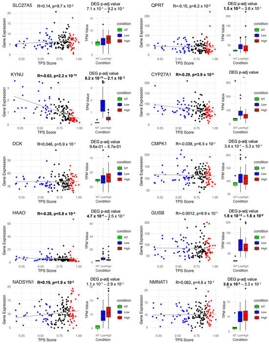 Correlation and differential expression of 10 essential genes for cancer models. This figure illustrates that although many essential genes are common across various models, 10 genes are uniquely crucial to cancer models. The figure features a scatter plot correlation tumour purity score (TPS) with gene expression and a box plot comparing gene expression across NT vs. Low TPS and High TPS conditions. Blue (Low TPS), black (Mid TPS), and red (High TPS). The grey line represents the linear regression fit (R).