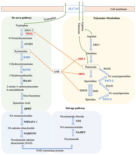 NAD+ biosynthesis via tryptophan de nova biosynthesis and integration with polyamines. This diagram outlines the kynurenine and polyamine metabolism with the NAD+ salvage pathway, underscoring their significant roles in immune modulation and cancer. It shows the enzymatic conversion of tryptophan and arginine into crucial intermediates impacting immune responses and cellular health, along with the essential recycling of nicotinamide into NAD+. Connections through shared enzymes, SLC7A7 and AHR, emphasise their collective influence on immune function and cancer pathways.