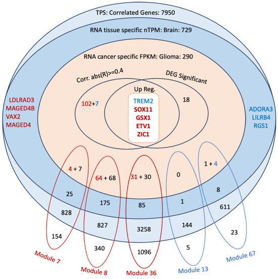 Candidate gene selection framework for GBM therapy. This figure illustrates a multifaceted approach to identifying potential therapeutic targets for GBM, integrating several analytic techniques. The Venn diagram merges DEG analysis, co-expression network analysis, and correlation analysis along with tissue expression information from the Human Protein Atlas, which includes the expression pattern of a gene across tissues. The colour-coding distinguishes between genes: blue for negatively correlated genes and red for positively correlated genes. The labelled modules, colour-coded to indicate significant matches with either positively or negatively correlated genes, represent clusters that consist of genes from each analytical layer. This comprehensive selection process aims to distinguish genes central to the pathophysiology of GBM, which could be key targets for developing more precise therapeutic strategies.