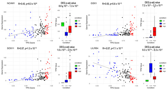 Differential expression and correlation profiles of marker genes in GBM according to TPS: This figure presents the DEG and correlation profiles of GSX1, SOX11, LILRB4, and NCAM1 based on TPS (Tumor Proportion Score). GSX1, SOX11, and NCAM1 are positively correlated with TPS, while LILRB4 is negatively correlated. DEG p-adj value represents the comparison of Low TPS to NT and High TPS to NT, respectively. Categories include NT (Normal Tissue), Low (Low TPS group), and High (High TPS group). Blue (Low TPS), black (Mid TPS), and red (High TPS). The grey line represents the linear regression fit (R).