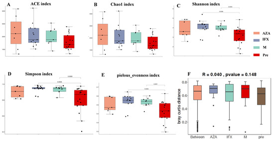 Our study found there were no difference in the Chao1 index and ACE index among the four groups, suggesting that there was no significant difference in species richness (Figure 1A,B). The IFX and M groups were statistically different from the Pre group in Shannon index, Simpson index, and evenness indices (Figure 1C–E), suggesting that infliximab and mesalazine may increase the diversity and homogeneity of intestinal microbiota. Beta diversity analysis was calculated by non-parametric statistical tests. We found difference between groups, but the difference was not significant (R = 0.04, Figure 1F).
