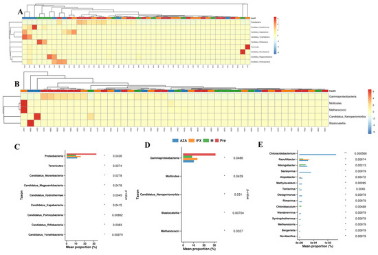 Taxonomic differences in the fecal microbiota in different treatment groups. (A) Heatmap of phylum level; (B) heatmap of class level; (C) bar graph of phylum level; (D) bar graph of class level; (E) bar graph of genus level. * p < 0.05, ** p < 0.01.