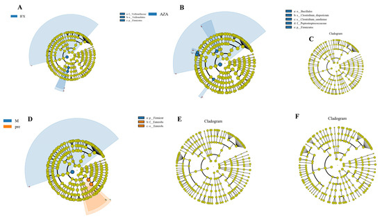 LEfSe analysis of species between different treatment modalities. The circles radiating from the inside to the outside of the evolutionary branching diagram represent the taxonomic levels from kingdom to species; the coloring principle was that the species with no significant differences were uniformly colored in yellow, with significant differences colored in red or blue. (A) IFX vs. Pre; (B) AZA vs. Pre; (C) IFX vs. AZA; (D) M vs. Pre; (E) IFX vs. M; (F) AZA vs. M.