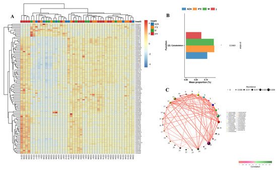 The Evolutionary Genealogy of Genes: Non-supervised Orthologous Groups (EggNOG) database was used to search for and annotate homologous genes, helping to study the evolution and function of homologous genes [10]. We used the EggNOG database to search for differences in homologous genes between the four groups (Figure 6A,B). The main difference in the functional composition of the gut bacteria of the four groups was in the cytoskeleton, which might be involved in intestinal barrier function, inflammation, and fibrosis through the cytoskeleton [11,12].