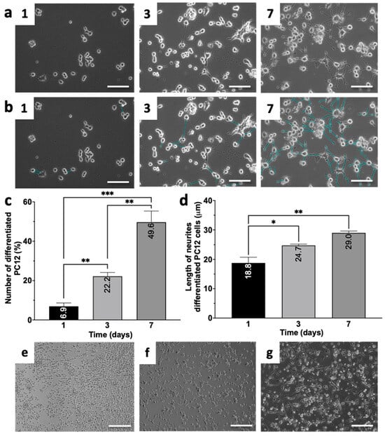 NGF-induced neuronal differentiation of PC12 cells and the PMA-induced differentiation of THP-1 cells into macrophages. Investigation of morphology (a), neurite length (b,d), and relative number of differentiated PC12 cells (c). The neurites are highlighted in blue (b). Micrographs of THP-1 cells without PMA treatment (e), after PMA treatment (f) (10 ng/mL, 24 h), and after LPS-induced differentiation into the M1 phenotype (g) (10 ng/mL PMA, 24 h + 1 μg/mL LPS, 72 h). Scale bars, 50 μm (a,b) or 100 μm (e–g). The error is indicated as SEM. * p < 0.05, ** p < 0.01, and *** p < 0.001.