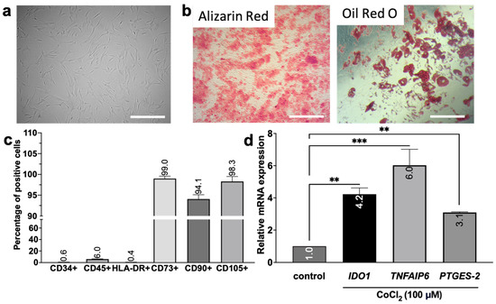 An investigation of MSC phenotypic characteristics was conducted. The cells had plastic adherence and a fibroblast-like (spindle-shaped) morphology, as shown in Figure 2a. After the cells were cultured in the medium that induced osteogenic differentiation, calcium deposits were observed via Alizarin Red staining (Figure 2b). Staining with Oil Red O also confirmed the occurrence of adipogenic differentiation (Figure 2b).