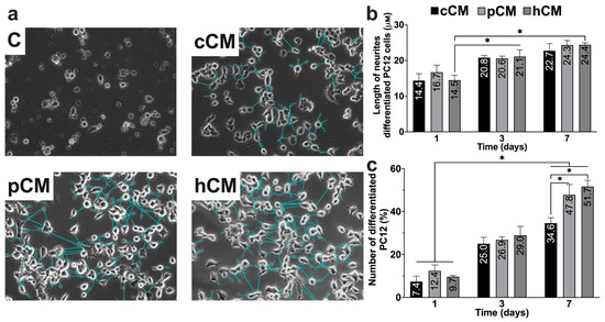 The treatment of PC12 cells with various types of CM led to an increase in the number of differentiated cells from day 1 to day 7 of exposure. Thus, treatment with cCM increased the number of differentiated cells by 27.2% (34.6 ± 5.1%), pCM increased the number of differentiated cells by 35.4% (47.8 ± 9.7%), and hCM increased it by 35.4% (51.7 ± 5.7%), compared with those in the control group on day 1 (7.4 ± 5.1%, 12.4 ± 5.5%, and 9.7 ± 1.1%, respectively). Notably, on day 7, the number of differentiated cells was significantly higher (p < 0.05) after induction with pCM or hCM than after induction with cCM (Figure 3a,c).