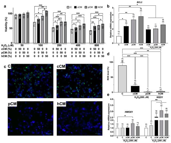 Thus, pretreatment of dPC12 cells with pCM and hCM resulted in a greater reduction in H2O2-induced intracellular ROS levels than did pretreatment with cCM. Moreover, exposure to hCM seems to lead to the observed effect on trPC12 cells due to the activation of BCL2, whereas in the case of pCM, it involves antioxidant-protective genes such as NQO1 and HMOX1.