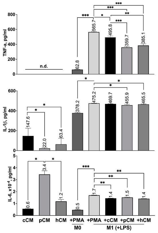 MSCs may have a paracrine-mediated effect on microglia/macrophages, including their polarization into a pro- or anti-inflammatory phenotype [49,61,62]. M0 macrophages were differentiated into the proinflammatory M1 phenotype by treatment with LPS at a concentration of 1 μg/mL for 72 h. The immunomodulatory potential of CMs was assessed by their effect on the differentiation of M0 cells into M1 macrophages. This was determined by measuring the levels of M1-specific proinflammatory cytokines in the conditioned medium via ELISA [63,64,65]. To represent the M1 phenotype, the following cytokines were chosen: TNF-α, IL-1β, and IL-6 (Figure 5).