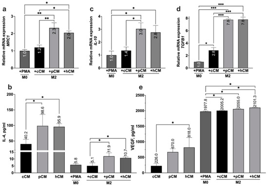 To investigate the effect of MSC-derived CMs on the differentiation of M0 macrophages into M2 macrophages, we treated M0 macrophages with cCM, pCM, or hCM for 72 h. M2 macrophages are known to play a role in reducing excessive inflammation by secreting anti-inflammatory cytokines [63,64,65,66]. In this study, the levels of IL-4 and VEGF in the culture medium of M2-induced macrophages were assessed via ELISA, as were the expression of genes that characterize the M2 phenotype (MRC1, IL-10, and TGFB1) via qRT‒PCR (Figure 6).