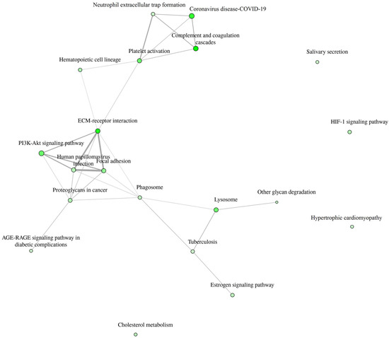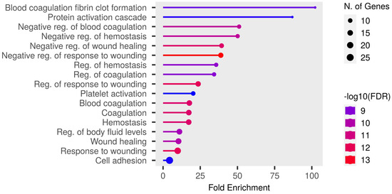 Detailed data are shown in the Supplementary File S1 and presented as graphs, divided into three types of analyses regarding molecular function, biological process, cellular component (Figure 1, Figure 2 and Figure 3; (http://bioinformatics.sdstate.edu/go/) accessed on 1 June 2024 [13]) and interactive enrichment network graph (Figure 4, (http://bioinformatics.sdstate.edu/go/://bioinformatics.sdstate.edu/go/) accessed on 1 June 2024 [13]).
