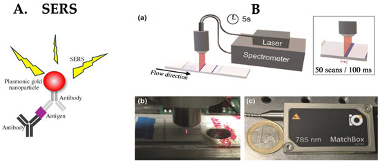 (A) The principle of surface-enhanced Raman scattering (SERS). (B) A schematic depiction of an LFA based on SERS. (a) A schematic representation of a portable Raman reader with an LFA. An averaged Raman spectrum from the entire test line (TL) (approximately 4 mm) is obtained within only 5 s by illuminating along the entire width of the TL with a line focus, and then moving the test strip orthogonally to it using a motorized stage. (b) Image of SERS scanning using custom-designed optical fiber probe. (c) A photograph of a compact 785 nm diode laser. Figure adapted from Angew. Chem. Int. Ed. 2019, 58, 442–446. Publication date: 5 October 2018. https://doi.org/10.1002/anie.201810917, accessed on 22 July 2024. Copyright © 2018 The Authors. Published by Wiley-VCH Verlag GmbH & Co. KGaA. This is an open access article under the CC BY license. Used under CC-BY. Ref. [81].