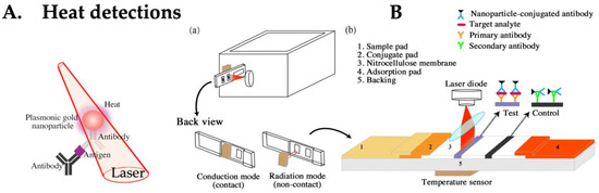 (A) The principle of heat detection for LFA. (B) Schematic diagram of the plasmonic thermal sensing for the LFA. (a) The model of a portable device and the main components (top) with two different sensing modes (bottom). (b) Schematic showing an LFA with thermal sensing setting. Figure adapted from Nanoscale Research Letters 2020,15,10. Publication date: 13 January 2020. https://doi.org/10.1186/s11671-019-3240-3, accessed on 22 July 2024. This is an open access article under the CC-BY license. Used under CC-BY. Ref. [85].