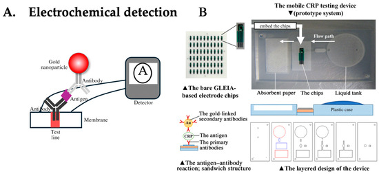 (A) The principle of electrochemical (EC) detection. (B) Structure of EC-LFA applied for C-reactive protein (CRP) detection, showing the production process from the chips to the prototype and the schematic of gold-linked electrochemical immunosorbent assay (GLEIA) measurement. The mobile CRP-testing device (prototype system) was embedded with the GLEIA-based electrode chips and the liquid tank. The diagram depicting the reaction occurring on the chip is shown at the lower left. The cross-section of the plastic case is shown at the lower right. Adapted from JMIR mHealth uHealth. 2020 Sep 7;8(9): e18782. Publication date: 7 September 2020. https://doi.org/10.2196/18782, accessed on 22 July 2024. Copyright © 2020 JMIR mHealth and uHealth. This is an open access article under the CC-BY license. Used under CC-BY Ref. [88].