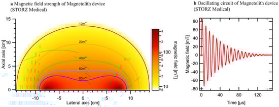 Extracorporeal Magnetotransduction Therapy (EMTT) is an innovative approach for treating musculoskeletal disorders by using pulsed electromagnetic fields. EMTT systems typically feature a decaying sinusoidal magnetic field with an oscillation frequency between 100 kHz and 300 kHz and a field strength reaching 80 mT (Figure 2a,b). We measured the electromagnetic wave strength for each well on a standardized well plate. The central wells exhibited a magnetic wave strength of 80 mT, while the marginal wells showed a slightly lower strength of 74 mT (Figure 2a). To ensure consistent treatment conditions and mitigate any potential limitations due to varying magnetic field strengths, we selected the central wells for our experiments. The transmitter coil, characterized by high inductance (L) and low resistance (R), generates the magnetic field, penetrating biological tissue relatively undisturbed. This field’s spatial distribution can be calculated using Biot–Savarts law, determined by the coil geometry and current flow. EMTT’s mode of action may involve the induction of electrical fields, generation of force (e.g., Lorentz force, torque on magnetic structures), excitation or modulation of excited states (e.g., Zeeman effect, radical pair), and potential thermal effects. However, the primary mechanism likely involves the magnetic field’s rapid oscillation and high amplitude, generating a strong electrical field by induction. This transduction power, exceeding 60,000 T/s for EMTT, is thought to drive therapeutic effects.