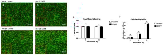 EMTT stimulation has no impact on the cell viability. (a–d) The hOBs were stained using the live/dead viability/cytotoxicity kit on days 7 (a,b) and 14 (c,d). Four representative images are illustrated. Stained with calcein AM (viable cells stain green) and ethidium homodimer 1 (non-viable cells stain red; see red arrow). (e) Quantification of living and dead cells was conducted based on counting cells of three wells. Each well is represented by five image excerpts, totaling 15 representative sections (5 per well). (f) The measured absorbance at 450 nm (corrected with 620 nm) represents the proliferation rate of hOBs using the WST-1 reagent. Cells were stimulated with EMTT according to our stimulation protocol (Figure 1b). Data are expressed as the average ± SD of three independent experiments (n = 3). ns: non-significant. two-tailed Student’s t-test.